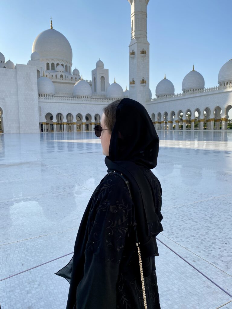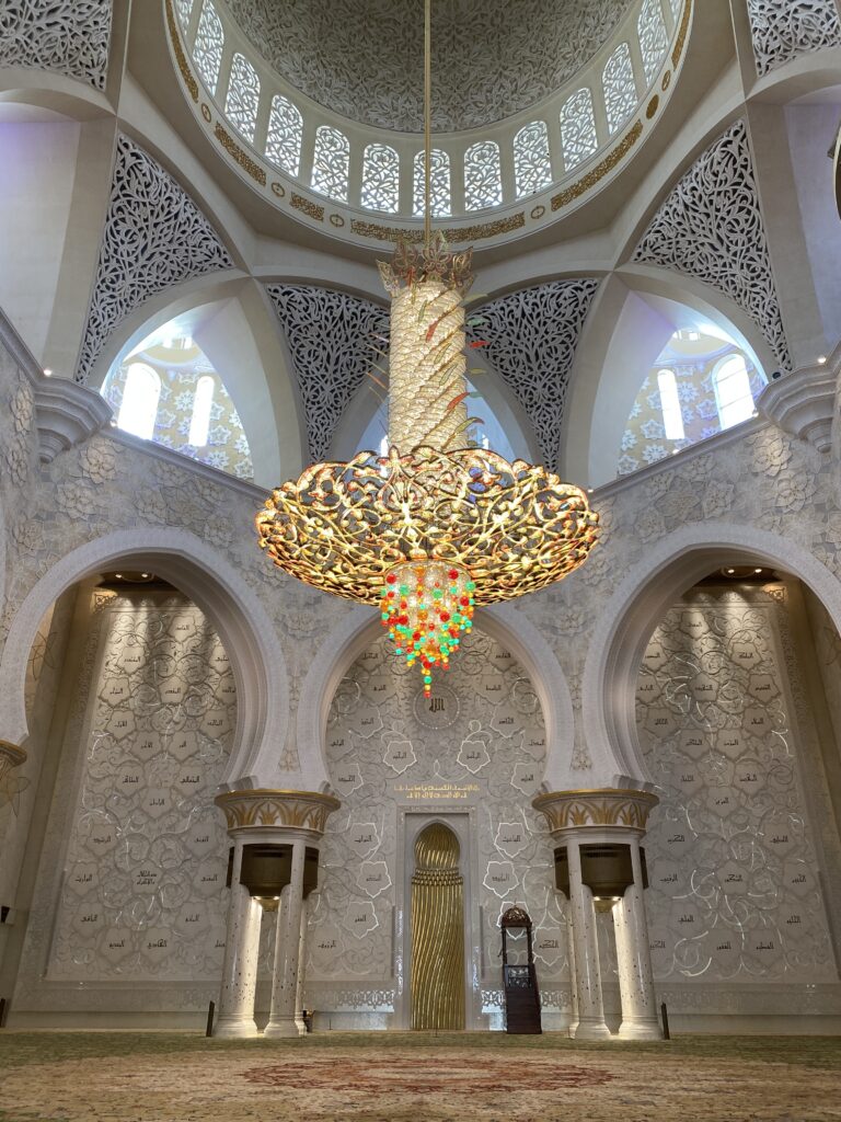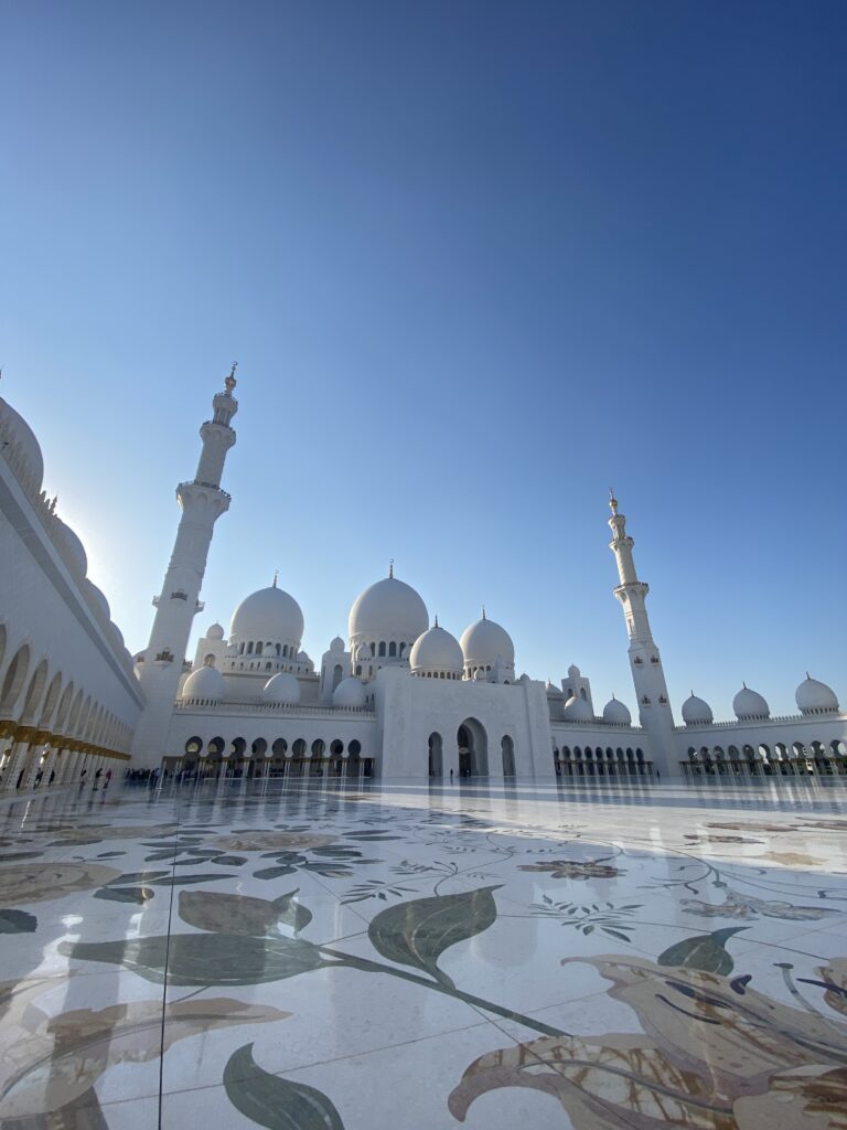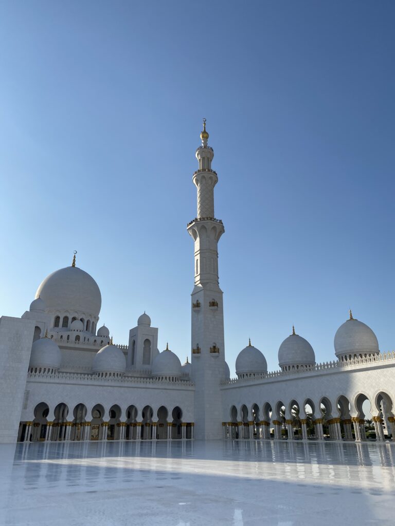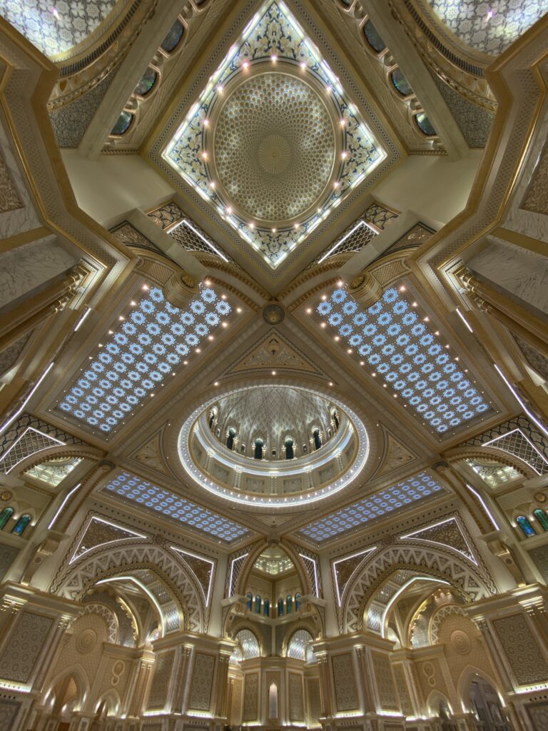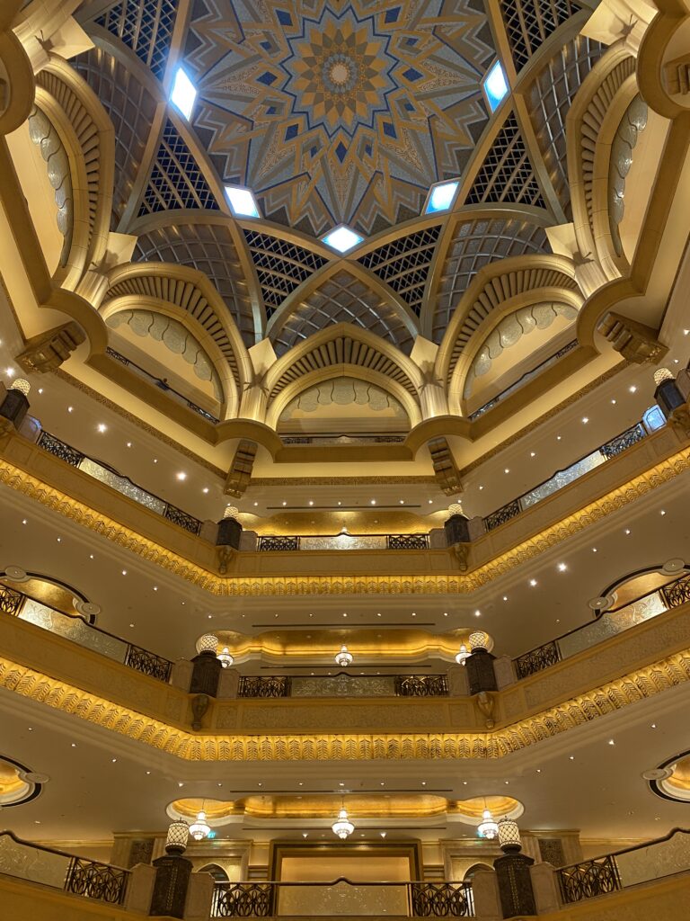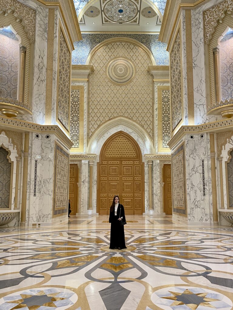 Cultural highlights in Abu Dhabi are nothing short of spectacular. The Louvre Abu Dhabi is a masterpiece where art, architecture, and engineering merge seamlessly. The iconic dome with its intricate, high-tech design creates a magical play of light that must be experienced in person. A visit to Emirates Palace Mandarin Oriental feels like stepping into another world. This landmark hotel is a sightseeing attraction on its own, famous for its real gold details, from décor to the famous 24k gold coffee. The hallways seem endless, stretching impressively long, and ongoing renovations throughout the year ensure that every corner looks flawless and immaculate. Qasr Al-Watan leaves a lasting impression with its architectural grandeur and deep sense of history. Walking through its vast halls makes you feel wonderfully small, surrounded by craftsmanship, symmetry, and cultural significance. Another absolute must-see is the Sheikh Zayed Grand Mosque, an extraordinary symbol of beauty, spirituality, and design. Every detail — from the marble to the chandeliers — feels intentional and breathtaking, creating a serene and respectful atmosphere.
